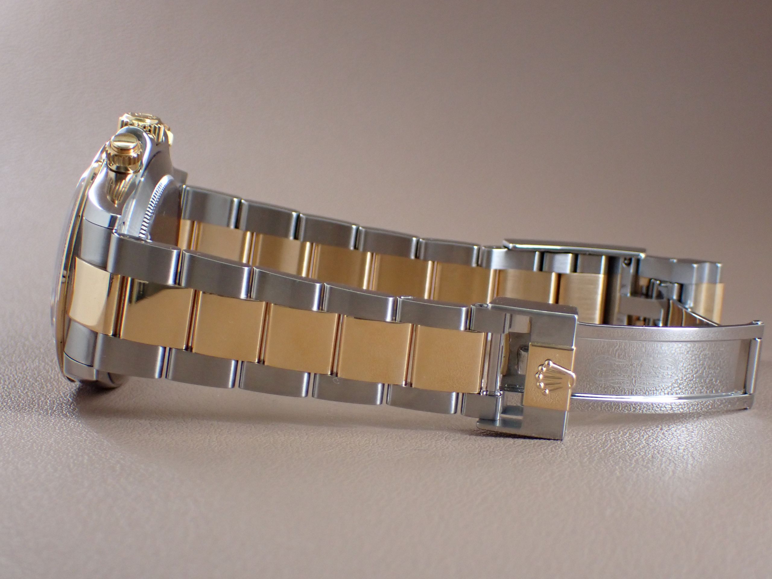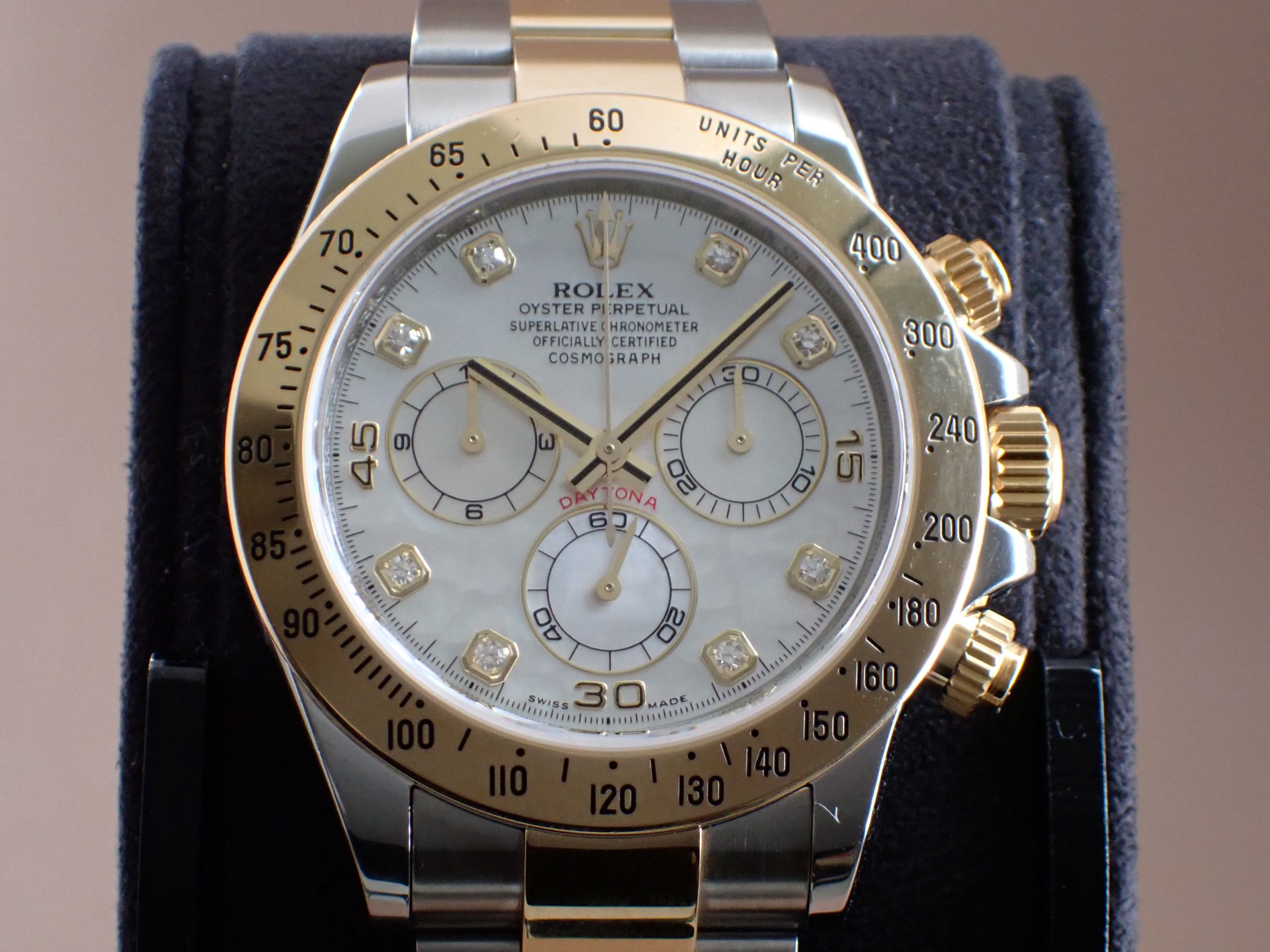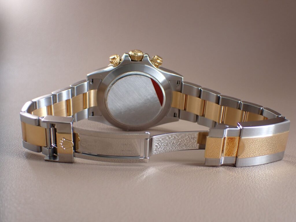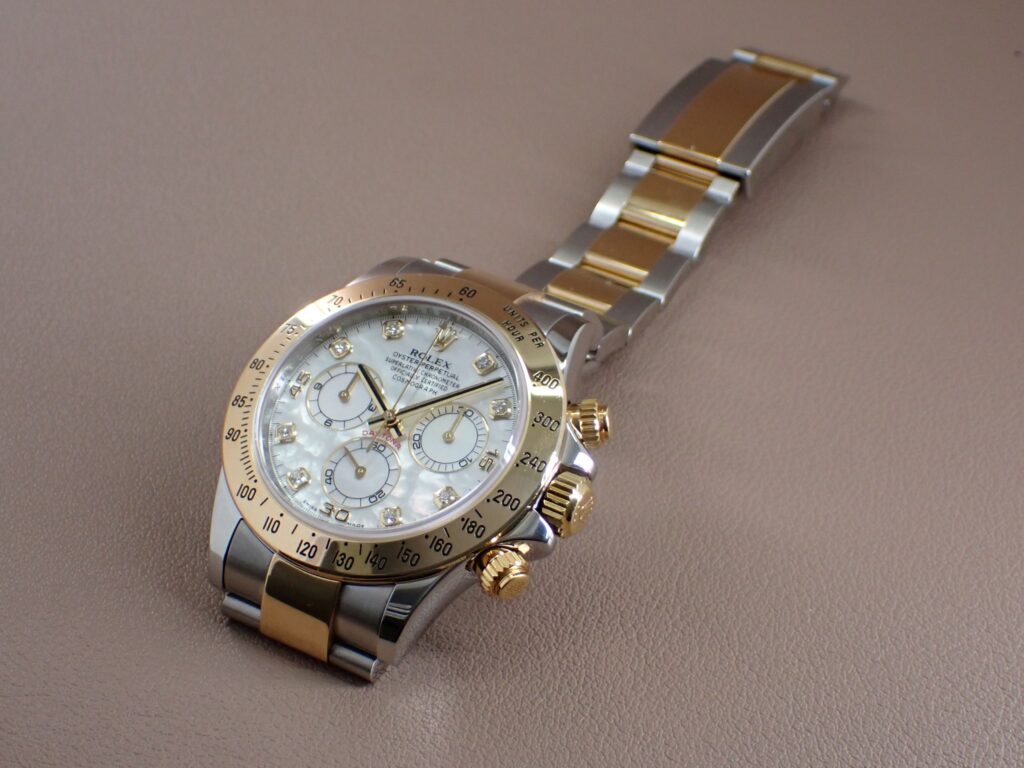 | 2000年から2016年まで製造されていた『デイトナ Ref.116523NG』です。 ステンレススティールと18Kイエローゴールドのコンビ素材にダイヤルは マザーオブパール(白蝶貝)を使用しており、豪華過ぎる雰囲気が魅力です。 マザーオブパールと言えば、光の入り方や角度によって見え方が異なりますので 世界に一つだけのダイヤルとなります。1月30日より3月1日までクリアランスセール を開催中。お買い得品を大量投入しておりますので、是非お買い求め下さいませ。 |