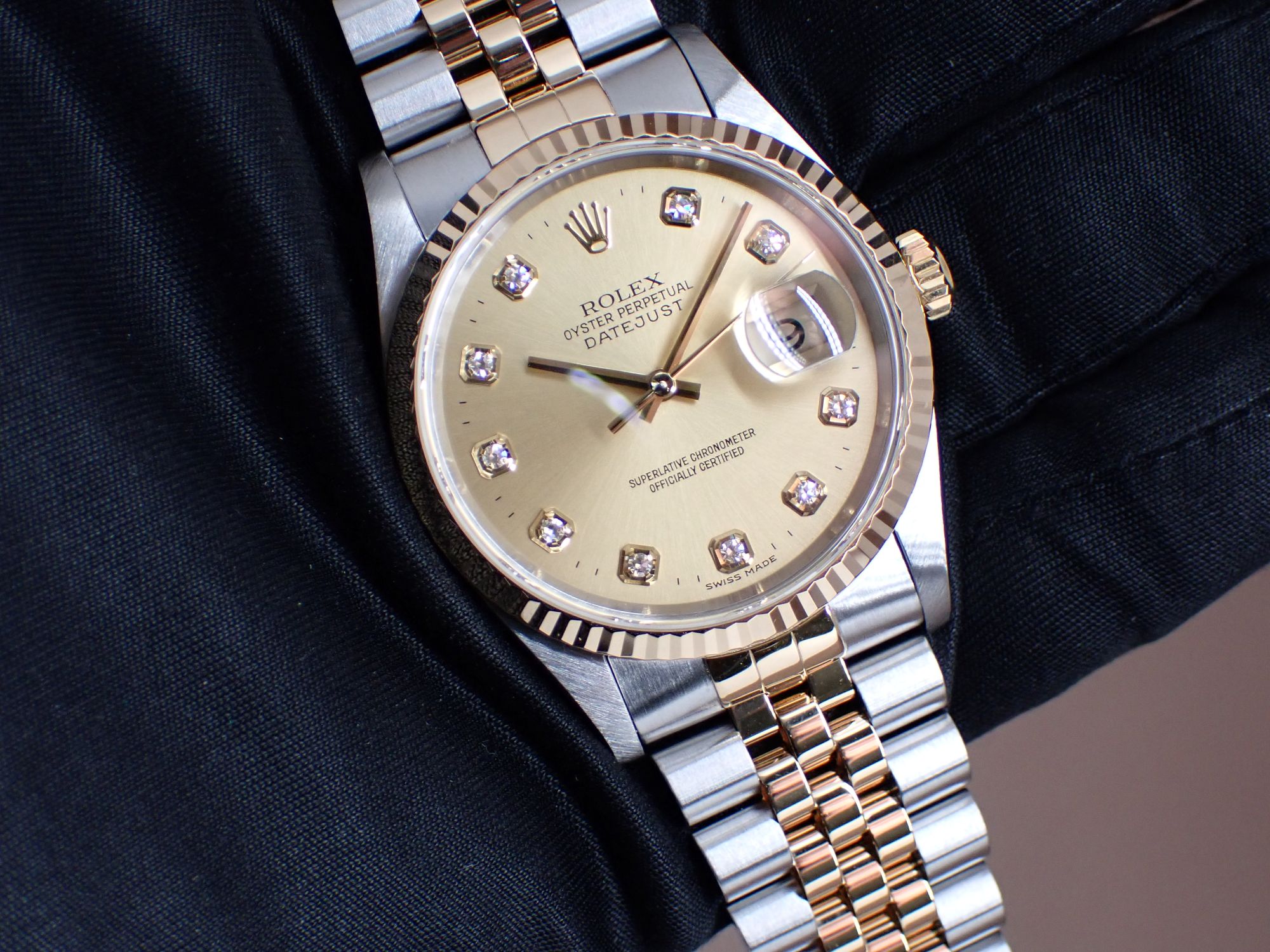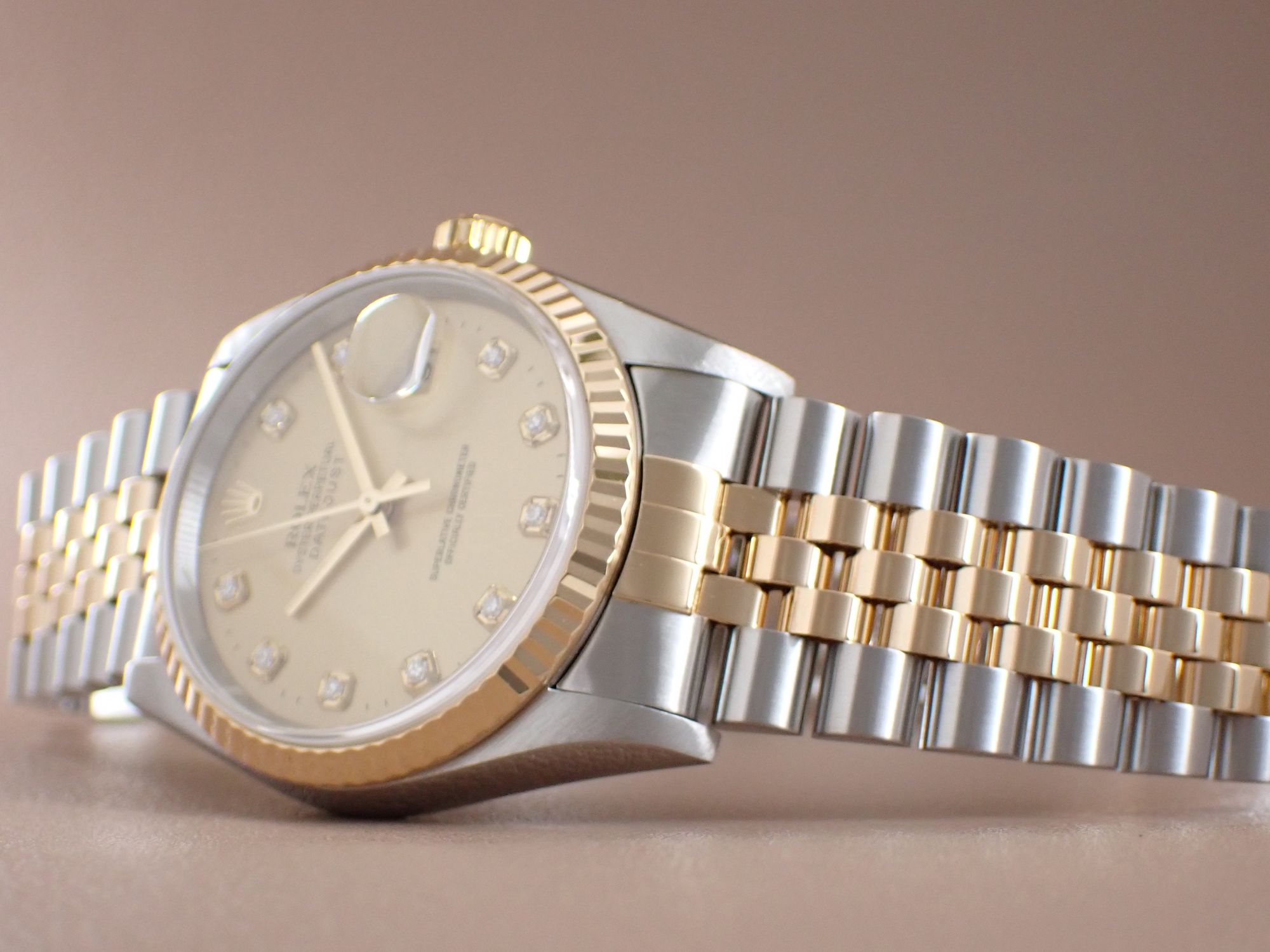 ステンレススチールとイエローゴールドのコンビネーションにジュビリーブレス、ダイヤルには10Pダイヤ、そしてケース径36ミリ!
